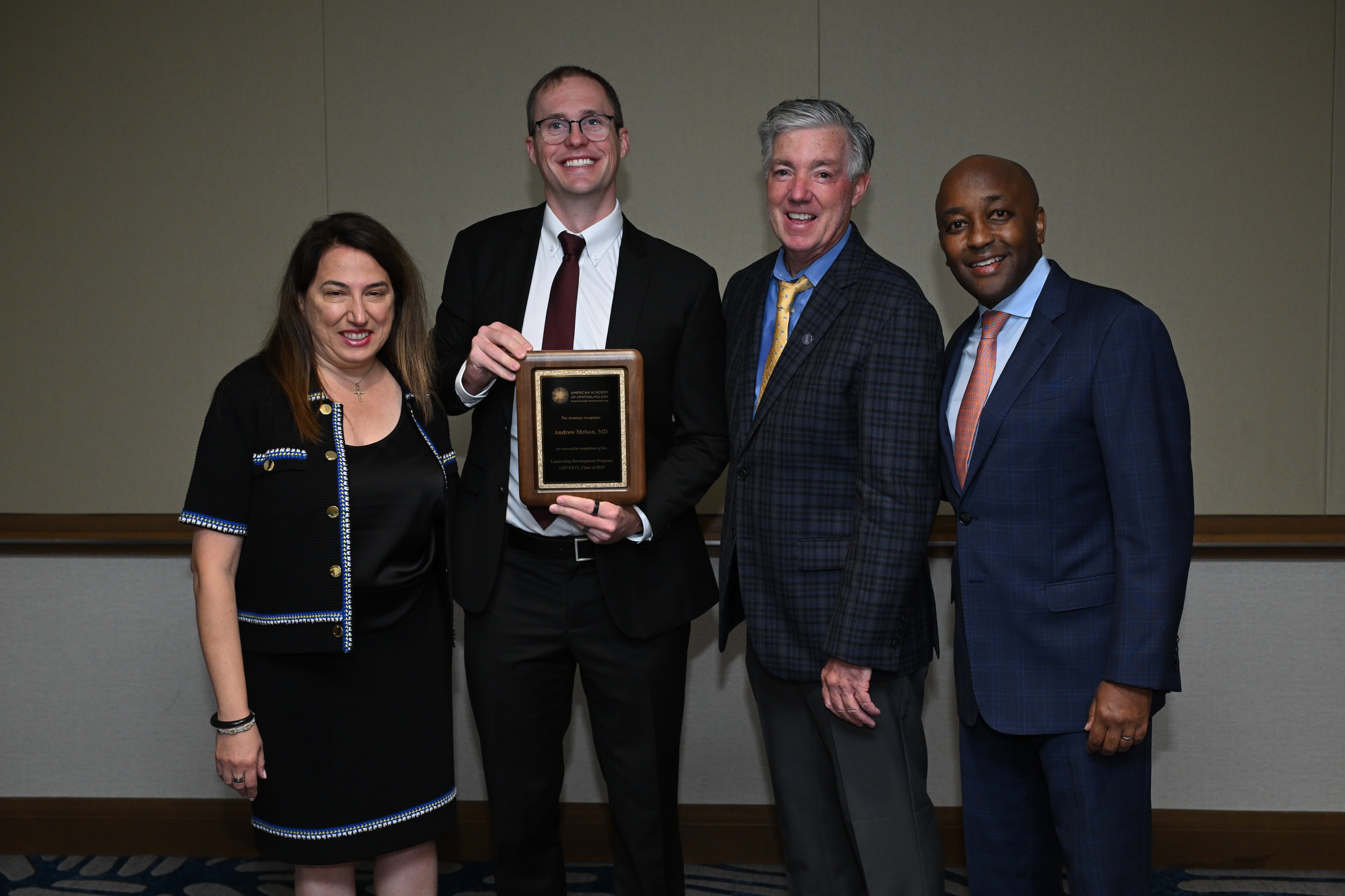 On Sunday, October 19, during the Society Presidents’ Recognition and Awards Session held in conjunction with AAO 2025 in Orlando, FL, Dr. Andrew Melson was recognized for completing the Academy’s Leadership Development Program XXVI, Class of 2025. Selected from a competitive pool of nominees representing state, subspecialty, and specialized interest societies, the class also included two international participants nominated by the Middle East Africa Council of Ophthalmology and the Canadian Ophthalmological Society.
